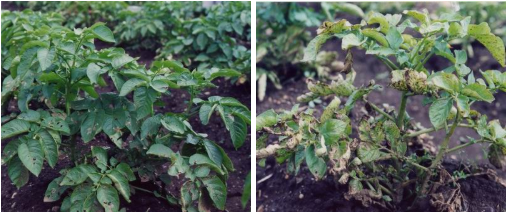 施喷富华农的马铃薯树壮叶绿,根部发展良好,有效促进果胶质产生,果胶质的粘胶膜是植物的防护衣,免受病毒感染,大大增强免疫能力,有效防治斑点病及黄叶病.同时每株树平均增产幅度高达30%.马铃薯肥大均匀,重量增加,大大提高株树产值.对照区内没有施喷富华农的马铃薯,抗病毒能力弱,出现严重斑点病及黄叶卷叶情况.对照区内每株树平均产量非常低.