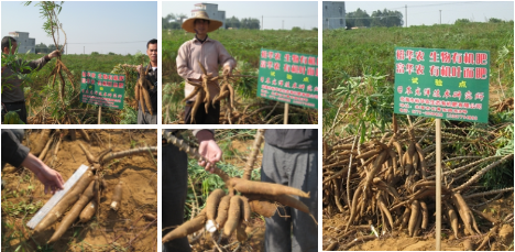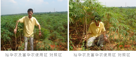 广西北海 裕华农及富华农使用区: 使用区内的木薯生长快,长势茂盛,木薯肥大 均匀,每株产量多, 增产效果明显. 对照区: 木薯生长慢, 长势较弱,树株矮小,茎幼细小. 裕华农及富华农使用区内的木薯长势明显茂盛, 茎粗呈深红色, 叶墨绿, 生长快. 对照区内, 长势较弱, 树株矮小. 显示裕华农有效加速幼苗生长, 大大提早收荻期