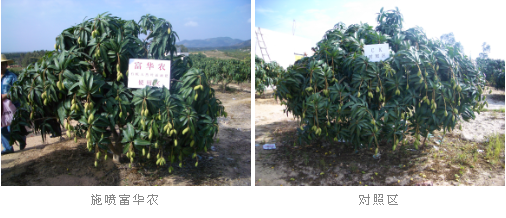 富华农的22种氨基酸有效促进生长细胞的分裂配合纳米技术生产,其黏附力和散播的平均度惊人,保证芒果肥大均匀,果皮青绿,抗病毒能力强,果肉密度高,重量增加,大大提高产量及一级品的比例.对照区内的果皮出现红斑点问题,大大影向商品价值.
