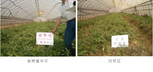 湖南长沙 长沙华中气调果菜保鲜有限公司农场 品种:台湾地瓜叶(蔬菜用) 使用方法 : 1:500倍 使用次数:第一次喷布9月10日,第二次移栽后9月18日,尚未完成到收割期.经2次喷施富华农后,与对比不喷施有明显不同,使用区生长壮旺,繁密叶茂,叶子整齐形大,萃绿,对比没有施喷富华农早收成15天.对照区内长势较弱,株植矮小颜色欠缺翠绿光泽