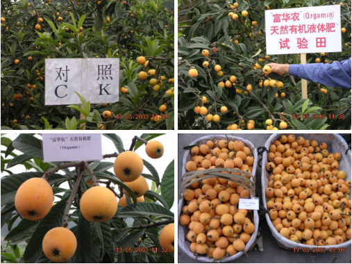 中国四川简阳县盛产枇杷-施喷富华农后,有效促进枇杷树内源生长素产生,枇杷树座果率高,果形肥大均匀,颜色鲜艳,味道清香甜美.批杷树粗壮茂盛,叶子颜色深绿,大大提高抗旱,抗寒,抗病防虫能力.有效稳定醯胺酶(植物内源保鲜剂),保鲜能力强,大大延长储藏期.对照区内的批杷果形细小,品质较劣,座果率低.