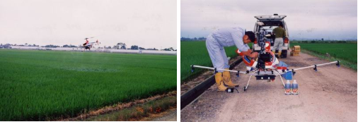 图片展示日本米农采用摇空直升机施喷富华农. 地点是日本新泻稻米种植区,是日本最大稻米生产地.面对进口米激烈竞争,日本米农采用优质富华农有机液肥及先进设备改善稻米品质及增加产量,大大提高稻米市场价值.施喷富华农后,出苗整齐,苗株健壮,提高结实率,秆粒重,提早熟.