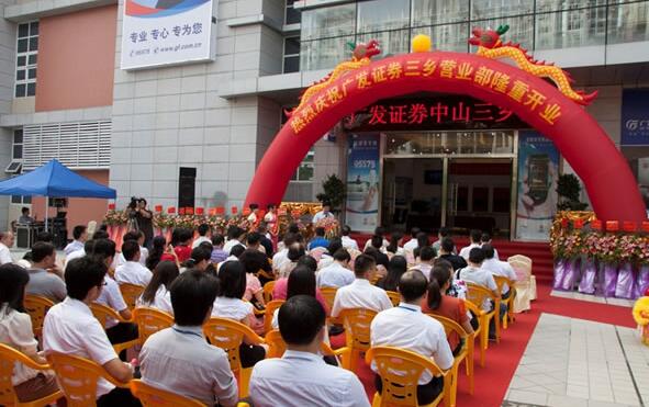 2012年08月08日,广发证券中山三乡证券营业部盛大开业。中山三乡营业部是中山区域中心辖下第4家营业部,该营业部开业将有助于我司在中山三乡镇区及周边的业务拓展,发挥中山区域中心经纪业务团队的营销能力特长,向客户提供优质服务。营业部地址位于中山市三乡镇景观大道3号文化中心一楼。