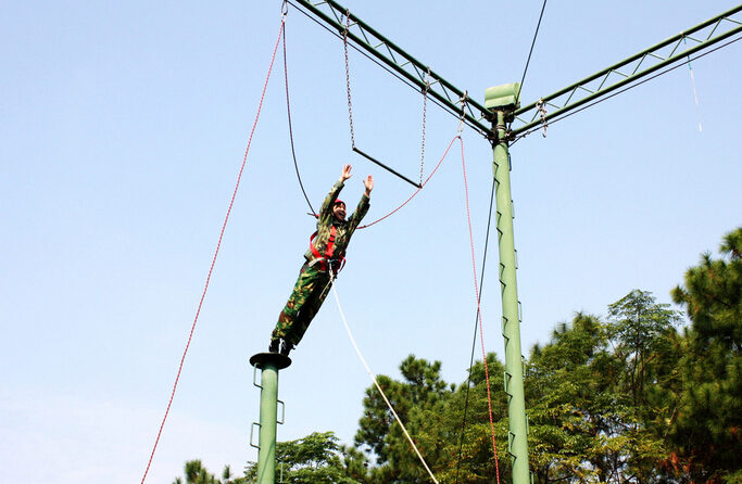 活动要求:要求全体学员都要做;正确戴好安全带、安全帽;学员按顺序攀到跳台,借助辅助绳站起然后屈膝,准备好以后奋力跃出,双手抓向单杠;由学员进行保护。