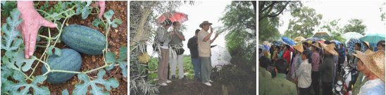 广西邕宁县盛产西瓜(黑美人),汉诺技术人员在田间指导农民利用叶面肥防治病害、农户亦分享使用富华农后的丰盛成果。