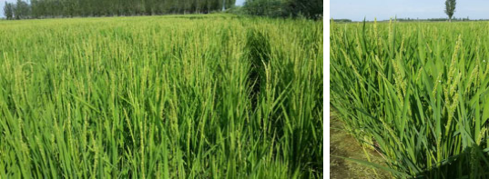 使用汉诺系列肥料(固肥、液肥、富华农叶面肥)后, 水稻群体均匀,抗倒伏能力强,分蘖与周围农田水稻相比明显增加,大大提高产量,稻穗饱满挺直,商品性高的「有机黄金大米」。