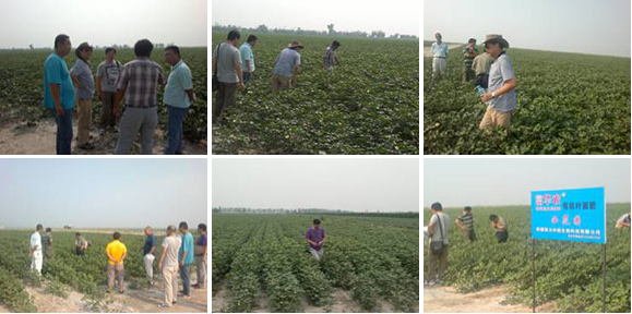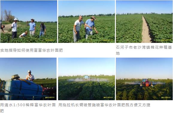 1. 新疆石河子市老沙湾镇棉花种植基地-针对棉花生产中常出现大量蕾铃脱落,对产量的负面影响极大的问题,实地指导采用生物技术(喷施富华农叶面肥)既可减少蕾铃脱落,又可实现高产高效。富华农叶面肥核心技术原理:在棉花生产中后期, 根部已呈显老化,根系吸收力(养份及水份)转弱,棉花因未能从根系及时吸收养份,引致蕾铃脱落而产量下降。针对中后期根部老化,喷施富华农叶面肥在叶片上可即时补充养份(22种天然胺基酸及中微量元素),透过叶片上的叶孔吸收,配合光合作用,可提高棉花自身新陈代谢力,促进棉花持续健康生长,防止蕾铃脱落、早衰问题及枯、黄萎病的发生。