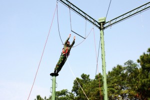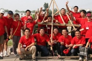 罗马炮架项目规则:分组团队在一个固定的战场利用资源(竹子九长一短,九根长绳。一把大勺,若干个汽球水弹)架起一尊古罗马炮架