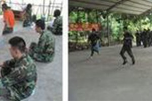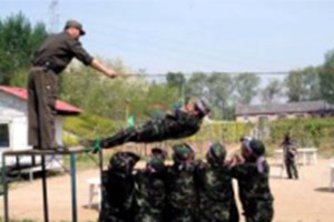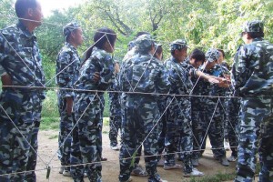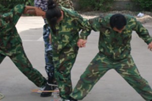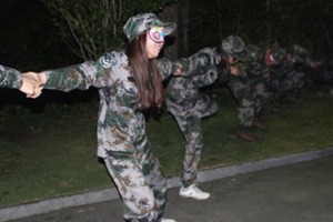 项目规则:所有参加训练的人员全部蒙上眼睛,并且脚上不穿戴任何可以护脚的东西。然后由每个小组的另一位队员的扶持下走一段崎岖